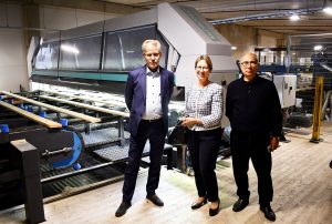 Kuva: Iisalmen Sahat Oy:n uuden tuotantolaitoksen avajaisiin oli saapunut myös maa- ja metsätalousministeri Sari Essayah, jolle uutta tuotantolaitosta esittelivät yrityksen omistajat Antti Väyrynen (vas.) ja